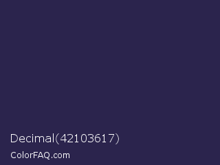 Decimal 42103617 Color is a very dark indigo color and the nearest color is Port Gore #251f4f. Hex code #2b244d and RGB value is rgb(43,36,77). In RGB color space, this color is composed of 17% red, 14% green, 30% blue, In CMYK color space, this color is composed of 44% cyan, 53% magenta, 0% yellow , 70% black , In HSL color space, this color has a hue angle of 250° , 36% saturation and 22% lightness.