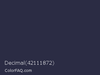 Decimal 42111872 Color is a very dark blue color and the nearest color is Ebony Clay #26283b. Hex code #2b2c44 and RGB value is rgb(43,44,68). In RGB color space, this color is composed of 17% red, 17% green, 27% blue, In CMYK color space, this color is composed of 37% cyan, 35% magenta, 0% yellow , 73% black , In HSL color space, this color has a hue angle of 238° , 23% saturation and 22% lightness.