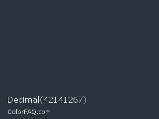 Decimal 42141267 Color is a very dark blue color and the nearest color is Gunmetal #2a3439. Hex code #2b313d and RGB value is rgb(43,49,61). In RGB color space, this color is composed of 17% red, 19% green, 24% blue, In CMYK color space, this color is composed of 30% cyan, 20% magenta, 0% yellow , 76% black , In HSL color space, this color has a hue angle of 220° , 17% saturation and 20% lightness.