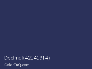 Decimal 42141314 Color is a dark blue color and the nearest color is Cloud Burst #202e54. Hex code #2b315a and RGB value is rgb(43,49,90). In RGB color space, this color is composed of 17% red, 19% green, 35% blue, In CMYK color space, this color is composed of 52% cyan, 46% magenta, 0% yellow , 65% black , In HSL color space, this color has a hue angle of 232° , 35% saturation and 26% lightness.