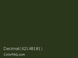 Decimal 42148181 Color is a very dark green color and the nearest color is Green Kelp #25311c. Hex code #2b371b and RGB value is rgb(43,55,27). In RGB color space, this color is composed of 17% red, 22% green, 11% blue, In CMYK color space, this color is composed of 22% cyan, 0% magenta, 51% yellow , 78% black , In HSL color space, this color has a hue angle of 86° , 34% saturation and 16% lightness.