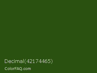 Decimal 42174465 Color is a very dark green color and the nearest color is Green House #24500f. Hex code #2b5111 and RGB value is rgb(43,81,17). In RGB color space, this color is composed of 17% red, 32% green, 7% blue, In CMYK color space, this color is composed of 47% cyan, 0% magenta, 79% yellow , 68% black , In HSL color space, this color has a hue angle of 96° , 65% saturation and 19% lightness.