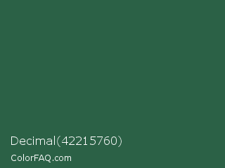 Decimal 42215760 Color is a dark green color and the nearest color is Stromboli #325d52. Hex code #2b6146 and RGB value is rgb(43,97,70). In RGB color space, this color is composed of 17% red, 38% green, 27% blue, In CMYK color space, this color is composed of 56% cyan, 0% magenta, 28% yellow , 62% black , In HSL color space, this color has a hue angle of 150° , 39% saturation and 27% lightness.