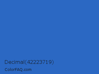 Decimal 42223719 Color is a normal blue color and the nearest color is Mariner #286acd. Hex code #2b68c3 and RGB value is rgb(43,104,195). In RGB color space, this color is composed of 17% red, 41% green, 76% blue, In CMYK color space, this color is composed of 78% cyan, 47% magenta, 0% yellow , 24% black , In HSL color space, this color has a hue angle of 216° , 64% saturation and 47% lightness.