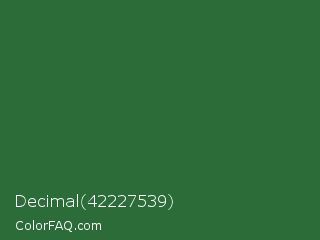 Decimal 42227539 Color is a dark green color and the nearest color is Mughal Green #306030. Hex code #2b6c39 and RGB value is rgb(43,108,57). In RGB color space, this color is composed of 17% red, 42% green, 22% blue, In CMYK color space, this color is composed of 60% cyan, 0% magenta, 47% yellow , 58% black , In HSL color space, this color has a hue angle of 133° , 43% saturation and 30% lightness.