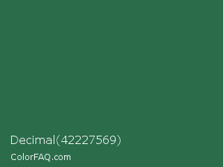Decimal 42227569 Color is a dark green color and the nearest color is Killarney #3a6a47. Hex code #2b6c4b and RGB value is rgb(43,108,75). In RGB color space, this color is composed of 17% red, 42% green, 29% blue, In CMYK color space, this color is composed of 60% cyan, 0% magenta, 31% yellow , 58% black , In HSL color space, this color has a hue angle of 150° , 43% saturation and 30% lightness.