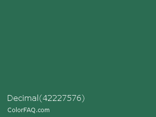 Decimal 42227576 Color is a dark green color and the nearest color is Stromboli #325d52. Hex code #2b6c52 and RGB value is rgb(43,108,82). In RGB color space, this color is composed of 17% red, 42% green, 32% blue, In CMYK color space, this color is composed of 60% cyan, 0% magenta, 24% yellow , 58% black , In HSL color space, this color has a hue angle of 156° , 43% saturation and 30% lightness.