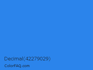 Decimal 42279029 Color is a normal blue color and the nearest color is Bleu De France #318ce7. Hex code #2b84eb and RGB value is rgb(43,132,235). In RGB color space, this color is composed of 17% red, 52% green, 92% blue, In CMYK color space, this color is composed of 82% cyan, 44% magenta, 0% yellow , 8% black , In HSL color space, this color has a hue angle of 212° , 83% saturation and 55% lightness.