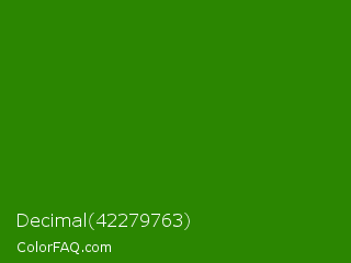 Decimal 42279763 Color is a dark green color and the nearest color is Napier Green #2a8000. Hex code #2b8601 and RGB value is rgb(43,134,1). In RGB color space, this color is composed of 17% red, 53% green, 0% blue, In CMYK color space, this color is composed of 68% cyan, 0% magenta, 99% yellow , 47% black , In HSL color space, this color has a hue angle of 101° , 99% saturation and 26% lightness.