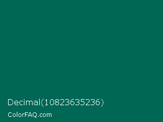 Decimal 10823635236 Color is a very dark cyan color and the nearest color is Bottle Green #006a4e. Hex code #006754 and RGB value is rgb(0,103,84). In RGB color space, this color is composed of 0% red, 40% green, 33% blue, In CMYK color space, this color is composed of 100% cyan, 0% magenta, 18% yellow , 60% black , In HSL color space, this color has a hue angle of 169° , 100% saturation and 20% lightness.