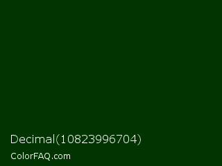 Decimal 10823996704 Color is a very dark green color and the nearest color is Deep Fir #002900. Hex code #013400 and RGB value is rgb(1,52,0). In RGB color space, this color is composed of 0% red, 20% green, 0% blue, In CMYK color space, this color is composed of 98% cyan, 0% magenta, 100% yellow , 80% black , In HSL color space, this color has a hue angle of 119° , 100% saturation and 10% lightness.