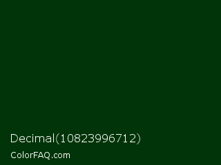 Decimal 10823996712 Color is a very dark green color and the nearest color is Deep Fir #002900. Hex code #013408 and RGB value is rgb(1,52,8). In RGB color space, this color is composed of 0% red, 20% green, 3% blue, In CMYK color space, this color is composed of 98% cyan, 0% magenta, 85% yellow , 80% black , In HSL color space, this color has a hue angle of 128° , 96% saturation and 10% lightness.