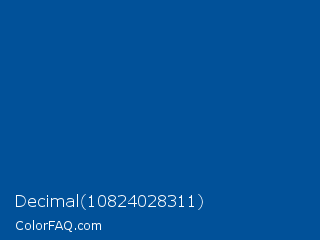 Decimal 10824028311 Color is a dark blue color and the nearest color is USAFA Blue #004f98. Hex code #015199 and RGB value is rgb(1,81,153). In RGB color space, this color is composed of 0% red, 32% green, 60% blue, In CMYK color space, this color is composed of 99% cyan, 47% magenta, 0% yellow , 40% black , In HSL color space, this color has a hue angle of 208° , 99% saturation and 30% lightness.