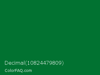 Decimal 10824479809 Color is a dark green color and the nearest color is La Salle Green #087830. Hex code #017231 and RGB value is rgb(1,114,49). In RGB color space, this color is composed of 0% red, 45% green, 19% blue, In CMYK color space, this color is composed of 99% cyan, 0% magenta, 57% yellow , 55% black , In HSL color space, this color has a hue angle of 145° , 98% saturation and 23% lightness.