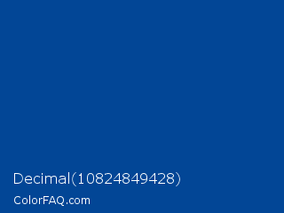 Decimal 10824849428 Color is a dark blue color and the nearest color is Congress Blue #02478e. Hex code #024696 and RGB value is rgb(2,70,150). In RGB color space, this color is composed of 1% red, 27% green, 59% blue, In CMYK color space, this color is composed of 99% cyan, 53% magenta, 0% yellow , 41% black , In HSL color space, this color has a hue angle of 212° , 97% saturation and 30% lightness.