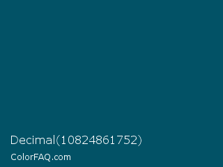 Decimal 10824861752 Color is a very dark cyan color and the nearest color is Blue Stone #016162. Hex code #025266 and RGB value is rgb(2,82,102). In RGB color space, this color is composed of 1% red, 32% green, 40% blue, In CMYK color space, this color is composed of 98% cyan, 20% magenta, 0% yellow , 60% black , In HSL color space, this color has a hue angle of 192° , 96% saturation and 20% lightness.
