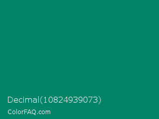 Decimal 10824939073 Color is a dark cyan color and the nearest color is Deep Sea #01826b. Hex code #028469 and RGB value is rgb(2,132,105). In RGB color space, this color is composed of 1% red, 52% green, 41% blue, In CMYK color space, this color is composed of 98% cyan, 0% magenta, 20% yellow , 48% black , In HSL color space, this color has a hue angle of 168° , 97% saturation and 26% lightness.