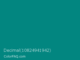 Decimal 10824941942 Color is a dark cyan color and the nearest color is Teal Green #00827f. Hex code #028680 and RGB value is rgb(2,134,128). In RGB color space, this color is composed of 1% red, 53% green, 50% blue, In CMYK color space, this color is composed of 99% cyan, 0% magenta, 4% yellow , 47% black , In HSL color space, this color has a hue angle of 177° , 97% saturation and 27% lightness.