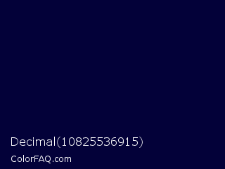 Decimal 10825536915 Color is a very dark indigo color and the nearest color is Stratos #000741. Hex code #030139 and RGB value is rgb(3,1,57). In RGB color space, this color is composed of 1% red, 0% green, 22% blue, In CMYK color space, this color is composed of 95% cyan, 98% magenta, 0% yellow , 78% black , In HSL color space, this color has a hue angle of 242° , 97% saturation and 11% lightness.