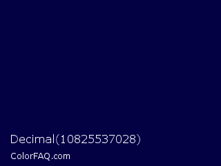 Decimal 10825537028 Color is a very dark indigo color and the nearest color is Stratos #000741. Hex code #030144 and RGB value is rgb(3,1,68). In RGB color space, this color is composed of 1% red, 0% green, 27% blue, In CMYK color space, this color is composed of 96% cyan, 99% magenta, 0% yellow , 73% black , In HSL color space, this color has a hue angle of 242° , 97% saturation and 14% lightness.