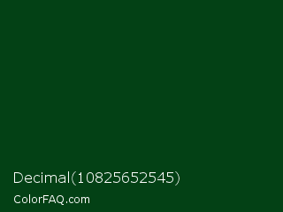 Decimal 10825652545 Color is a very dark green color and the nearest color is Crusoe #004816. Hex code #034115 and RGB value is rgb(3,65,21). In RGB color space, this color is composed of 1% red, 25% green, 8% blue, In CMYK color space, this color is composed of 95% cyan, 0% magenta, 68% yellow , 75% black , In HSL color space, this color has a hue angle of 137° , 91% saturation and 13% lightness.