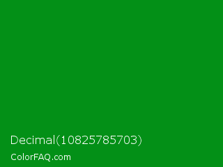 Decimal 10825785703 Color is a dark green color and the nearest color is Islamic Green #009000. Hex code #039017 and RGB value is rgb(3,144,23). In RGB color space, this color is composed of 1% red, 56% green, 9% blue, In CMYK color space, this color is composed of 98% cyan, 0% magenta, 84% yellow , 44% black , In HSL color space, this color has a hue angle of 129° , 96% saturation and 29% lightness.