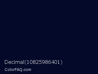 Decimal 10825986401 Color is a almost black blue color and the nearest color is Black Pearl #041322. Hex code #040929 and RGB value is rgb(4,9,41). In RGB color space, this color is composed of 2% red, 4% green, 16% blue, In CMYK color space, this color is composed of 90% cyan, 78% magenta, 0% yellow , 84% black , In HSL color space, this color has a hue angle of 232° , 82% saturation and 9% lightness.