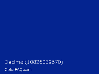 Decimal 10826039670 Color is a dark blue color and the nearest color is Imperial Blue #002395. Hex code #042490 and RGB value is rgb(4,36,144). In RGB color space, this color is composed of 2% red, 14% green, 56% blue, In CMYK color space, this color is composed of 97% cyan, 75% magenta, 0% yellow , 44% black , In HSL color space, this color has a hue angle of 226° , 95% saturation and 29% lightness.