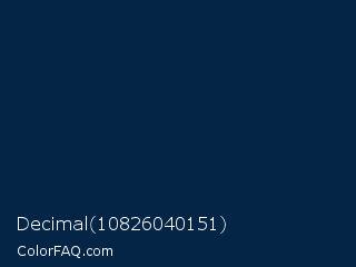 Decimal 10826040151 Color is a very dark blue color and the nearest color is Oxford Blue #002147. Hex code #042545 and RGB value is rgb(4,37,69). In RGB color space, this color is composed of 2% red, 15% green, 27% blue, In CMYK color space, this color is composed of 94% cyan, 46% magenta, 0% yellow , 73% black , In HSL color space, this color has a hue angle of 210° , 89% saturation and 14% lightness.