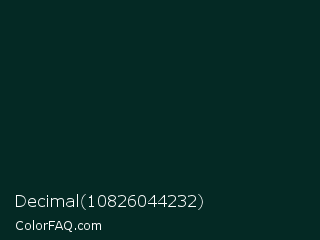 Decimal 10826044232 Color is a almost black cyan color and the nearest color is Burnham #002e20. Hex code #042924 and RGB value is rgb(4,41,36). In RGB color space, this color is composed of 2% red, 16% green, 14% blue, In CMYK color space, this color is composed of 90% cyan, 0% magenta, 12% yellow , 84% black , In HSL color space, this color has a hue angle of 172° , 82% saturation and 9% lightness.
