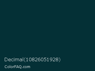 Decimal 10826051928 Color is a very dark cyan color and the nearest color is Tiber #063537. Hex code #043036 and RGB value is rgb(4,48,54). In RGB color space, this color is composed of 2% red, 19% green, 21% blue, In CMYK color space, this color is composed of 93% cyan, 11% magenta, 0% yellow , 79% black , In HSL color space, this color has a hue angle of 187° , 86% saturation and 11% lightness.