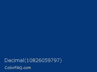 Decimal 10826059797 Color is a dark blue color and the nearest color is Catalina Blue #062a78. Hex code #043777 and RGB value is rgb(4,55,119). In RGB color space, this color is composed of 2% red, 22% green, 47% blue, In CMYK color space, this color is composed of 97% cyan, 54% magenta, 0% yellow , 53% black , In HSL color space, this color has a hue angle of 213° , 93% saturation and 24% lightness.