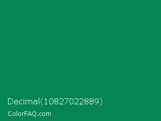 Decimal 10827022889 Color is a dark green color and the nearest color is Spanish Viridian #007f5c. Hex code #058455 and RGB value is rgb(5,132,85). In RGB color space, this color is composed of 2% red, 52% green, 33% blue, In CMYK color space, this color is composed of 96% cyan, 0% magenta, 36% yellow , 48% black , In HSL color space, this color has a hue angle of 158° , 93% saturation and 27% lightness.