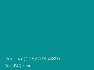 Decimal 10827035489 Color is a dark cyan color and the nearest color is Dark Cyan #008b8b. Hex code #059091 and RGB value is rgb(5,144,145). In RGB color space, this color is composed of 2% red, 56% green, 57% blue, In CMYK color space, this color is composed of 97% cyan, 1% magenta, 0% yellow , 43% black , In HSL color space, this color has a hue angle of 180° , 93% saturation and 29% lightness.
