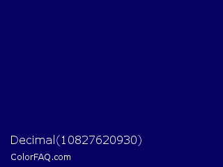 Decimal 10827620930 Color is a very dark indigo color and the nearest color is Arapawa #110c6c. Hex code #060162 and RGB value is rgb(6,1,98). In RGB color space, this color is composed of 2% red, 0% green, 38% blue, In CMYK color space, this color is composed of 94% cyan, 99% magenta, 0% yellow , 62% black , In HSL color space, this color has a hue angle of 243° , 98% saturation and 19% lightness.