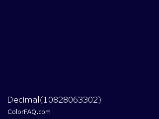 Decimal 10828063302 Color is a very dark indigo color and the nearest color is Black Rock #0d0332. Hex code #070336 and RGB value is rgb(7,3,54). In RGB color space, this color is composed of 3% red, 1% green, 21% blue, In CMYK color space, this color is composed of 87% cyan, 94% magenta, 0% yellow , 79% black , In HSL color space, this color has a hue angle of 245° , 89% saturation and 11% lightness.