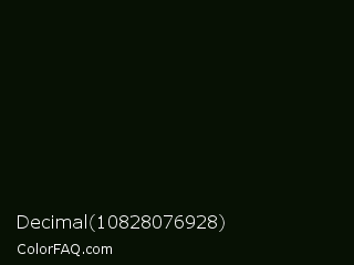 Decimal 10828076928 Color is a almost black green color and the nearest color is Midnight Moss #041004. Hex code #071104 and RGB value is rgb(7,17,4). In RGB color space, this color is composed of 3% red, 7% green, 2% blue, In CMYK color space, this color is composed of 59% cyan, 0% magenta, 76% yellow , 93% black , In HSL color space, this color has a hue angle of 106° , 62% saturation and 4% lightness.