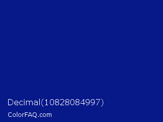 Decimal 10828084997 Color is a dark blue color and the nearest color is Phthalo Blue #000f89. Hex code #071889 and RGB value is rgb(7,24,137). In RGB color space, this color is composed of 3% red, 9% green, 54% blue, In CMYK color space, this color is composed of 95% cyan, 82% magenta, 0% yellow , 46% black , In HSL color space, this color has a hue angle of 232° , 90% saturation and 28% lightness.