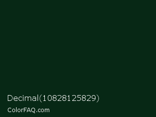 Decimal 10828125829 Color is a almost black green color and the nearest color is English Holly #022d15. Hex code #072815 and RGB value is rgb(7,40,21). In RGB color space, this color is composed of 3% red, 16% green, 8% blue, In CMYK color space, this color is composed of 83% cyan, 0% magenta, 48% yellow , 84% black , In HSL color space, this color has a hue angle of 145° , 70% saturation and 9% lightness.