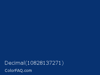 Decimal 10828137271 Color is a dark blue color and the nearest color is Catalina Blue #062a78. Hex code #073271 and RGB value is rgb(7,50,113). In RGB color space, this color is composed of 3% red, 20% green, 44% blue, In CMYK color space, this color is composed of 94% cyan, 56% magenta, 0% yellow , 56% black , In HSL color space, this color has a hue angle of 216° , 88% saturation and 24% lightness.
