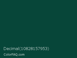 Decimal 10828157953 Color is a very dark cyan color and the nearest color is Rich Black #004040. Hex code #074639 and RGB value is rgb(7,70,57). In RGB color space, this color is composed of 3% red, 27% green, 22% blue, In CMYK color space, this color is composed of 90% cyan, 0% magenta, 19% yellow , 73% black , In HSL color space, this color has a hue angle of 168° , 82% saturation and 15% lightness.