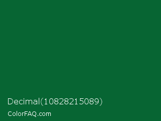 Decimal 10828215089 Color is a very dark green color and the nearest color is Fun Green #016d39. Hex code #076533 and RGB value is rgb(7,101,51). In RGB color space, this color is composed of 3% red, 40% green, 20% blue, In CMYK color space, this color is composed of 93% cyan, 0% magenta, 50% yellow , 60% black , In HSL color space, this color has a hue angle of 148° , 87% saturation and 21% lightness.