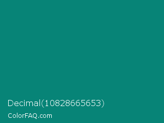 Decimal 10828665653 Color is a dark cyan color and the nearest color is Elf Green #088370. Hex code #078477 and RGB value is rgb(7,132,119). In RGB color space, this color is composed of 3% red, 52% green, 47% blue, In CMYK color space, this color is composed of 95% cyan, 0% magenta, 10% yellow , 48% black , In HSL color space, this color has a hue angle of 174° , 90% saturation and 27% lightness.