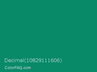 Decimal 10829111606 Color is a dark cyan color and the nearest color is Observatory #02866f. Hex code #088968 and RGB value is rgb(8,137,104). In RGB color space, this color is composed of 3% red, 54% green, 41% blue, In CMYK color space, this color is composed of 94% cyan, 0% magenta, 24% yellow , 46% black , In HSL color space, this color has a hue angle of 165° , 89% saturation and 28% lightness.