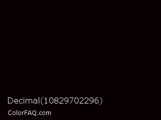 Decimal 10829702296 Color is a almost black red color and the nearest color is Rich Black FOGRA39 #010203. Hex code #090002 and RGB value is rgb(9,0,2). In RGB color space, this color is composed of 4% red, 0% green, 1% blue, In CMYK color space, this color is composed of 0% cyan, 100% magenta, 78% yellow , 96% black , In HSL color space, this color has a hue angle of 347° , 100% saturation and 2% lightness.