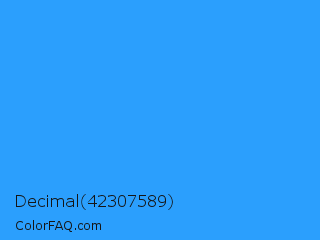 Decimal 42307589 Color is a normal blue color and the nearest color is Brilliant Azure #3399ff. Hex code #2b9ffd and RGB value is rgb(43,159,253). In RGB color space, this color is composed of 17% red, 62% green, 99% blue, In CMYK color space, this color is composed of 83% cyan, 37% magenta, 0% yellow , 1% black , In HSL color space, this color has a hue angle of 207° , 98% saturation and 58% lightness.