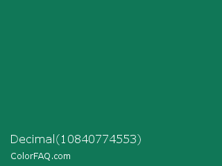 Decimal 10840774553 Color is a dark green color and the nearest color is Deep Green Cyan Turquoise #0e7c61. Hex code #107757 and RGB value is rgb(16,119,87). In RGB color space, this color is composed of 6% red, 47% green, 34% blue, In CMYK color space, this color is composed of 87% cyan, 0% magenta, 27% yellow , 53% black , In HSL color space, this color has a hue angle of 161° , 76% saturation and 26% lightness.