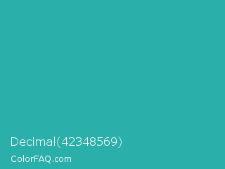 Decimal 42348569 Color is a normal cyan color and the nearest color is Light Sea Green #20b2aa. Hex code #2bafab and RGB value is rgb(43,175,171). In RGB color space, this color is composed of 17% red, 69% green, 67% blue, In CMYK color space, this color is composed of 75% cyan, 0% magenta, 2% yellow , 31% black , In HSL color space, this color has a hue angle of 178° , 61% saturation and 43% lightness.