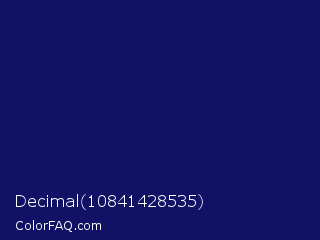 Decimal 10841428535 Color is a dark blue color and the nearest color is Arapawa #110c6c. Hex code #111165 and RGB value is rgb(17,17,101). In RGB color space, this color is composed of 7% red, 7% green, 40% blue, In CMYK color space, this color is composed of 83% cyan, 83% magenta, 0% yellow , 60% black , In HSL color space, this color has a hue angle of 240° , 71% saturation and 23% lightness.