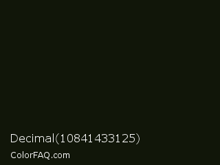Decimal 10841433125 Color is a almost black green color and the nearest color is Green Waterloo #101405. Hex code #111609 and RGB value is rgb(17,22,9). In RGB color space, this color is composed of 7% red, 9% green, 4% blue, In CMYK color space, this color is composed of 23% cyan, 0% magenta, 59% yellow , 91% black , In HSL color space, this color has a hue angle of 83° , 42% saturation and 6% lightness.